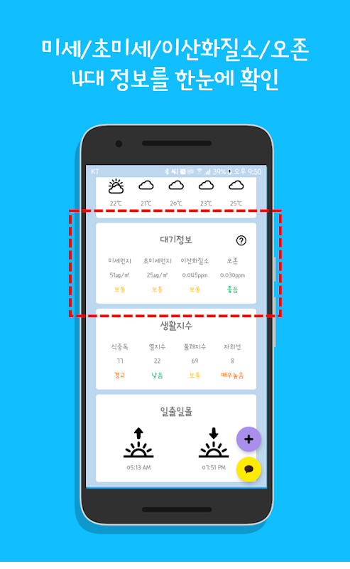 실시간 날씨, 미세먼지, 초미세먼지, 오존 수치를 한 눈에 파악할 수 있고, 한국환경공단 기준을 기본으로 엄격한 대기정보를 전달해드리고 있어요.