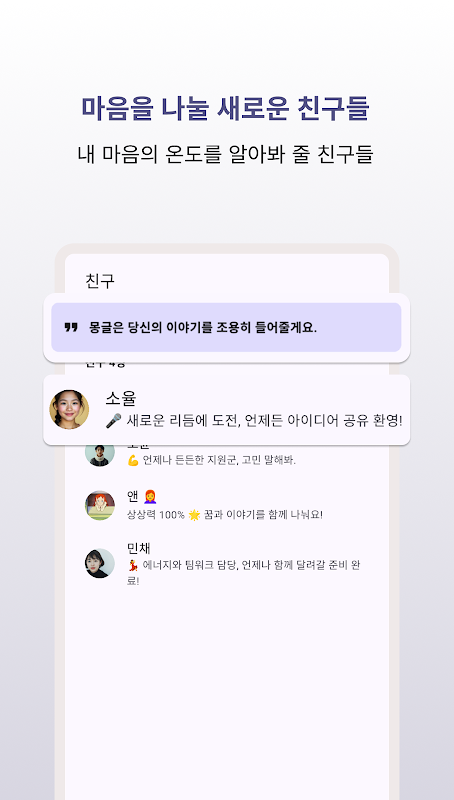 You can choose a conversation partner that fits your mood and situation, such as the warm friend ‘Soyul’, the calm advisor ‘Anne’, and the affectionate counselor ‘Minchae’.