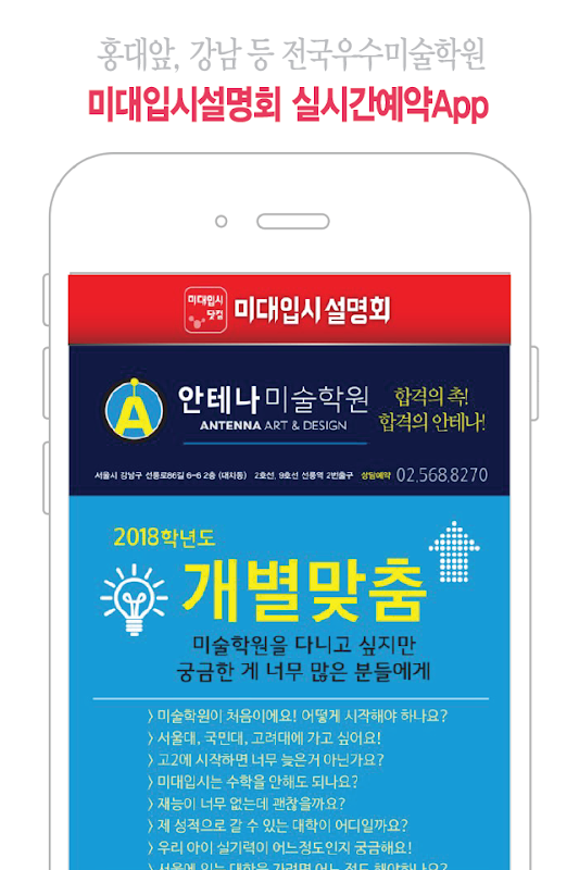 미대입시설명회 앱은 변화하는 미대입시정보와 입시지원전략을 안내해주는 미술대학 입시세미나 개최 정보를 모바일로 손쉽게 예약및 확인할수있는 앱입니다.
