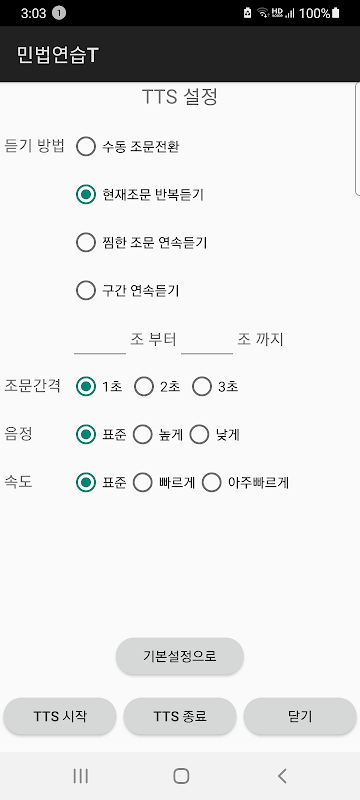 - 현재 조문 반복 듣기: 현재 선택된 조문을 무한 반복해서 들음