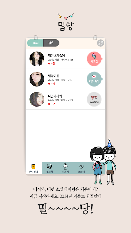 밀당은 밀고 당겨서 만드는 새로운 소셜데이팅입니다. 지금 시작하세요! ^^