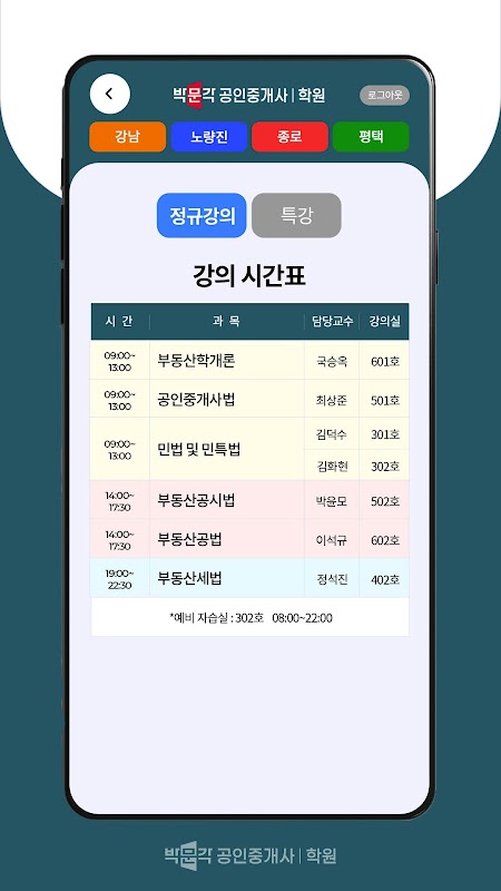 You can check information on notices, lecture details, classroom assignment tables, etc. provided by Gangnam Academy, Noryangjin Academy, Jongno Academy, and Pyeongtaek Academy.