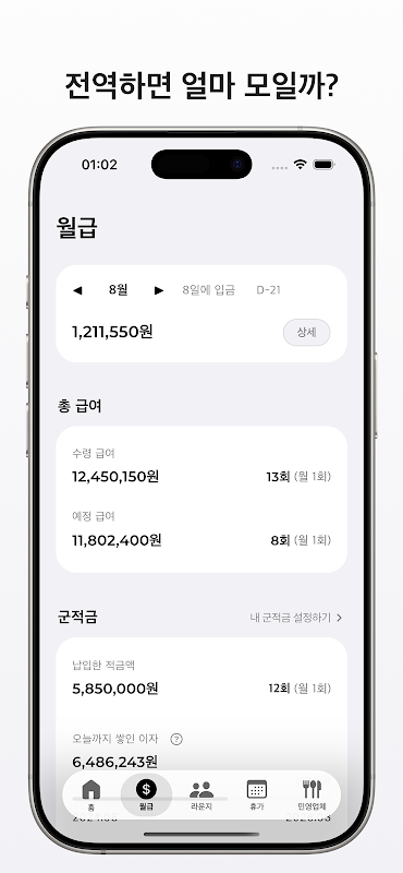 3. Salary/Savings: You can check the monthly salary amount and details. You can enter your military savings subscription information and check the accumulated interest and maturity principal!