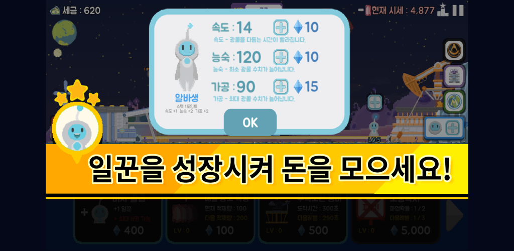 By collecting resources from the mine, you can hire more workers with the money you have saved. You can increase your stats!