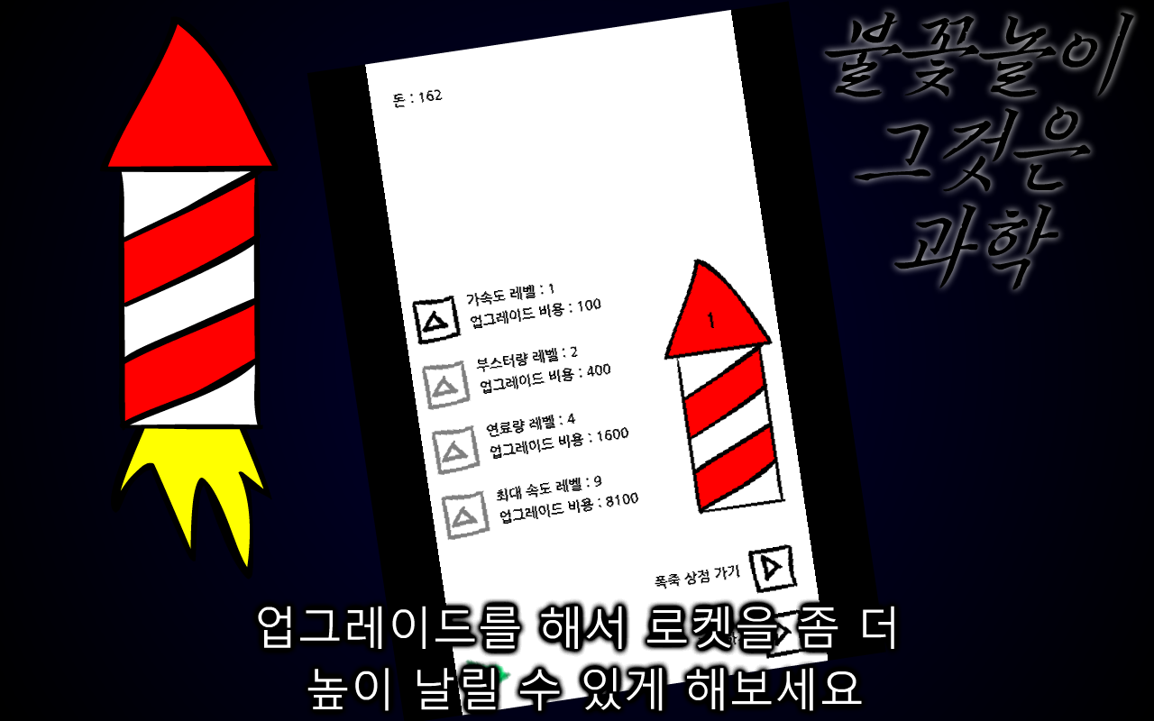 - 로켓이 날아가는 동안 화면을 터치하면 조금씩 더 멀리 날아가요!