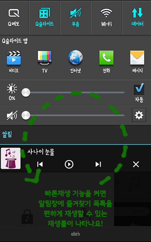 앱 내에서 해당 기능을 켜시면 상태바에 즐겨찾기 목록을 재생할 수 있는 재생툴이 제공됩니다.