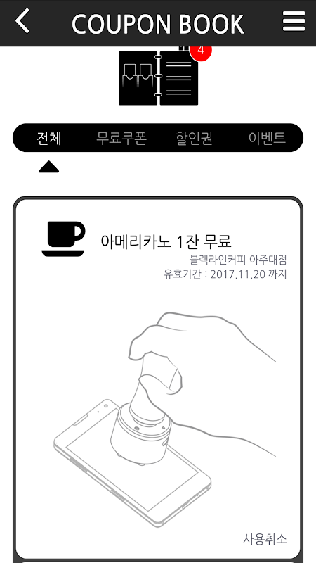 앱 화면에 매장 도장을 받으시면 스탬프가 찍힙니다.