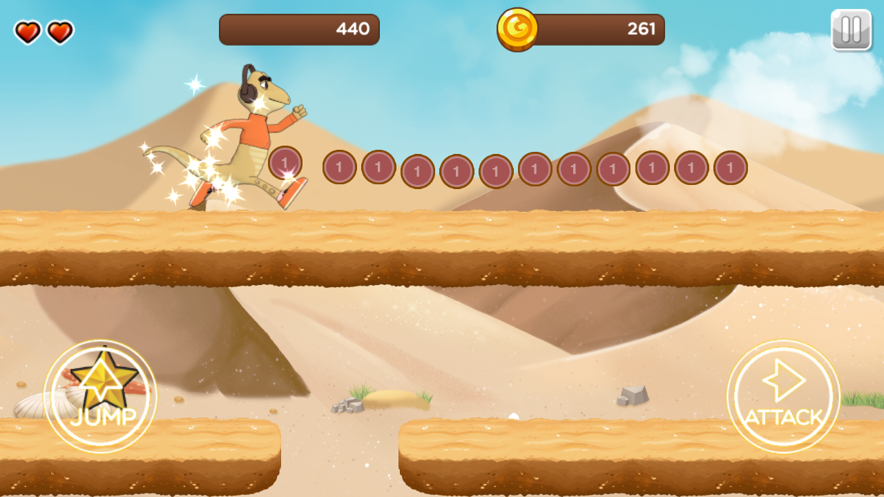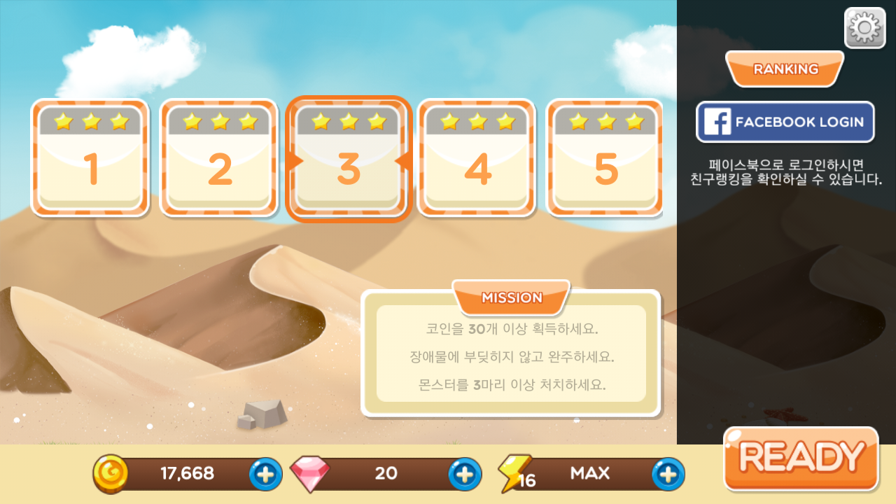 각 스테이지별로 미션을 클리어하며 사구 위를 달리는 게임입니다.