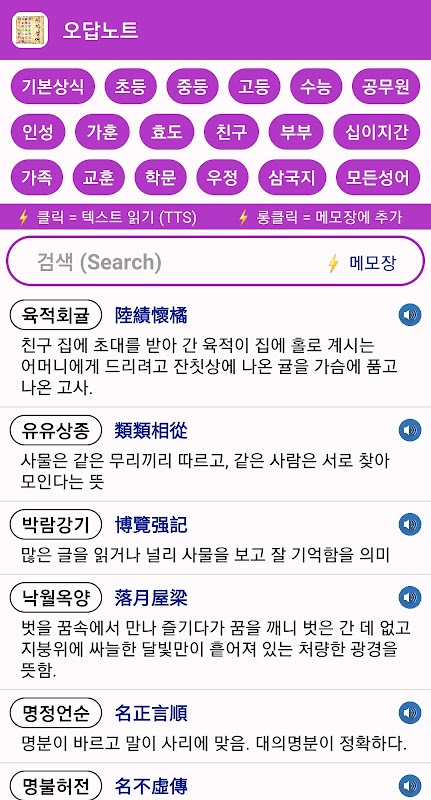 ■ You can quickly search by topic (Basic Common Sense, Elementary, Secondary, High School, SAT, Public Officials, Personality, Family Hun, filial piety, Friends, Couple, Zodiac, Family, Lesson, Academic, Friendship, Three Kingdoms...).