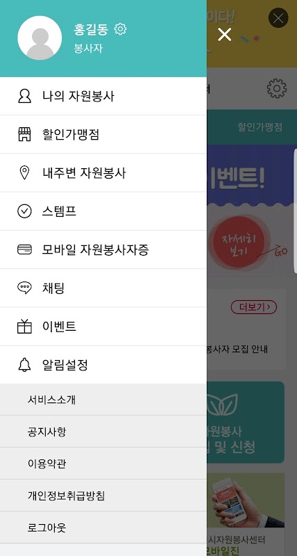 자원봉사 모집에 지원 신청 할 수 있고,내주변의 자원봉사, 활동처, 할인가맹점을 확인 할 수 있습니다.모바일 자원봉사자증 신청도 가능힙니다.