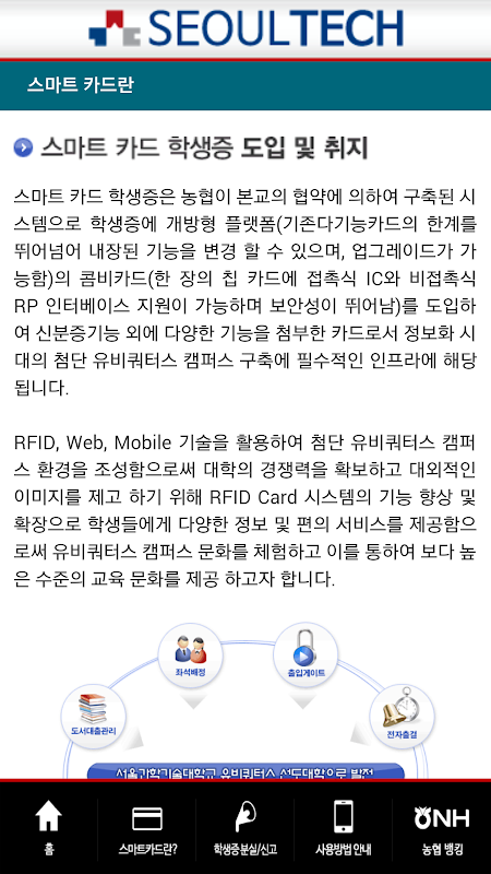 * 다른 단말기에 등록되어 있다는 메시지가 뜨는 경우 https://smartcard.seoultech.ac.kr/ 사이트에 접속하여, 로그인 한뒤 기기변경 신청을 하고, 어플실행 후 다시 로그인해주세요.