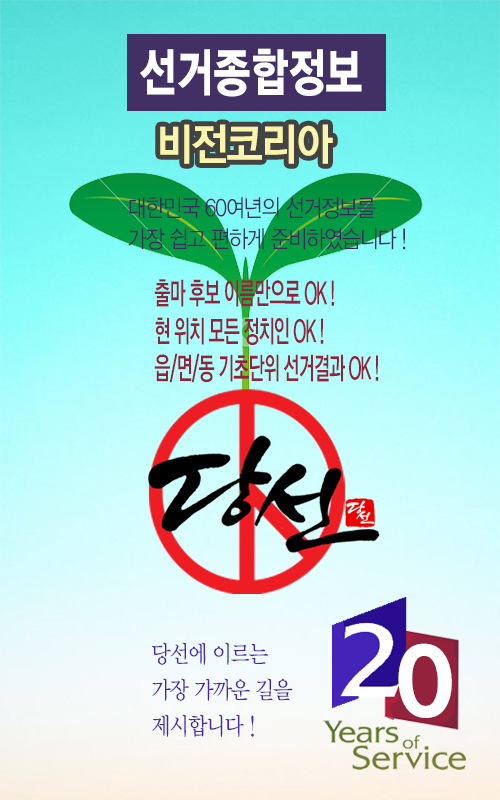 대한민국 60여년 공직선거 종합 서비스 - 출마후보 정보, 개표결과, 인물정보, 민주당, 한국당, 바른미래당 등 각정당 전당대회, 농협, 수협, 축협, 산림조합장 선거 정보, 출마자 종합정보, 개표결과 그래프 서비스를 진행하고 있습니다.