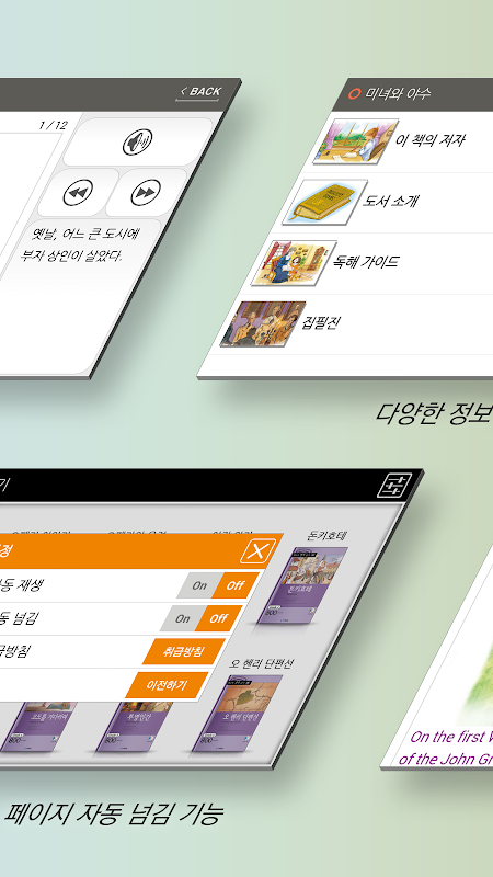 본 앱에 실린 명작들은 누구나 한번쯤 접해본 것들이라 영어로 읽어도 어렵지 않습니다. 다수의 원어민 전문 필진이 독자들의 수준에 맞게 단계별로 리라이팅해서, 자기 실력에 맞는 책을 쉽게 찾을 수 있습니다. 또한 교육부 선정 어휘를 가지고 표준 미국식 영어를 사용하였기 때문에 정규 교과학습은 물론 일반 성인의 영어듣기능력을 향상시켜줍니다.