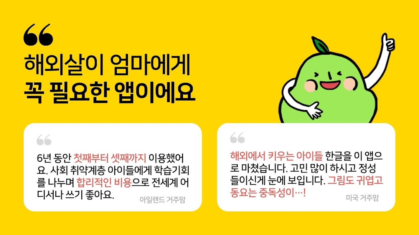 50만명의 부모님과 500여개 초등학교가 선택한 1등 한글 교육 앱, 소중한글로 모국어 학습을 시작하세요!