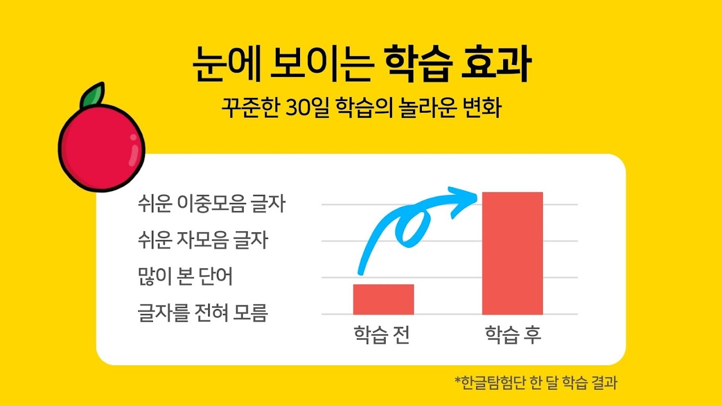 – 한글 교육을 받은 적 없는 아이 61명을 대상으로 하루 15분, 8주간 체험한 결과, 참여한 아이들 모두 기본 음절의 80% 이상을 정확히 읽어낼 수 있었습니다.
