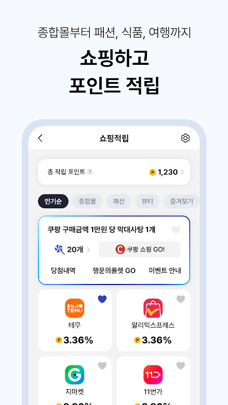 Earn shopping points from general malls to fashion, food, and travel products