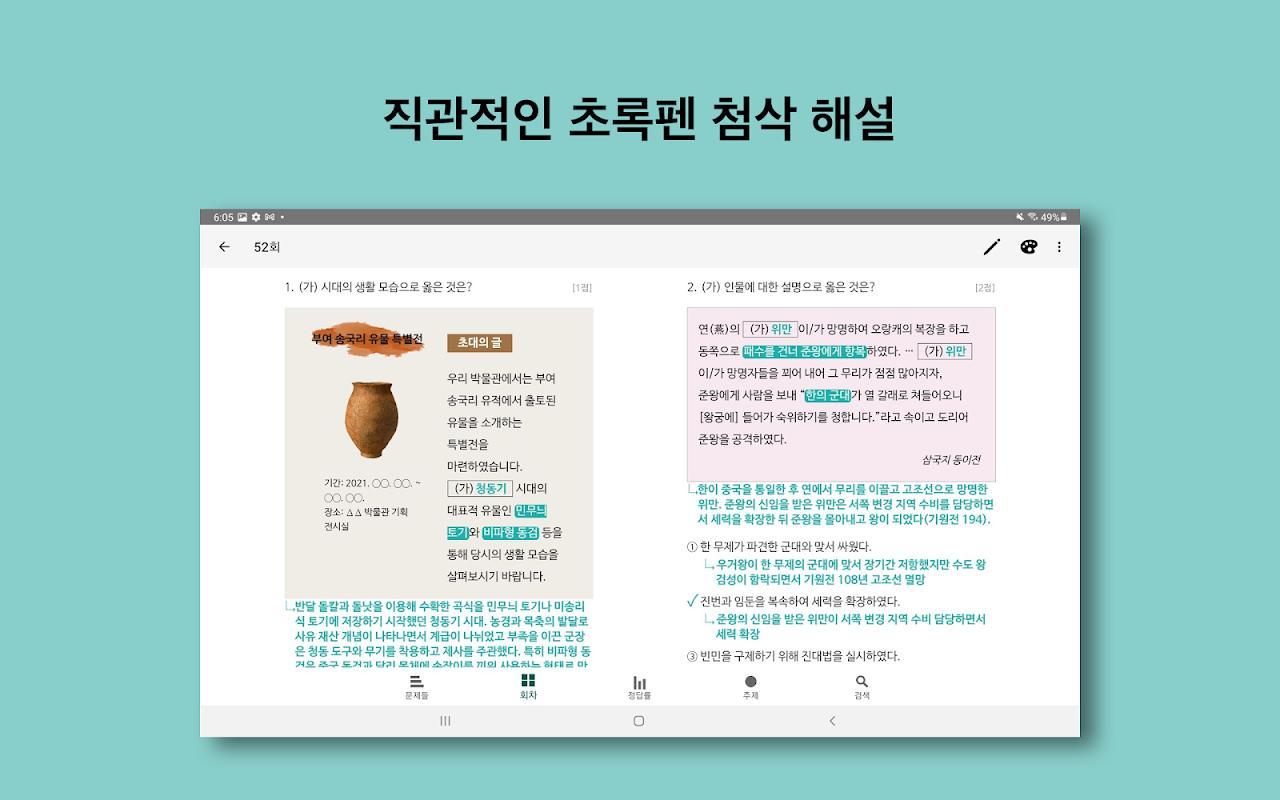Avoiding lengthy explanations displayed on a small screen, explanations are shown with a green pen directly where explanations are needed.