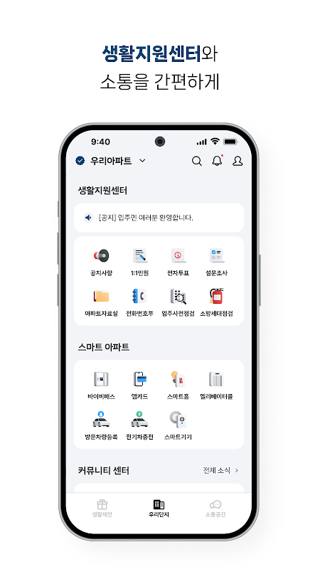 ✅ Functions necessary for residential life, such as living support center work, community center reservation, access, and payment, smart home control, common area access, and communication between residents, all at once.