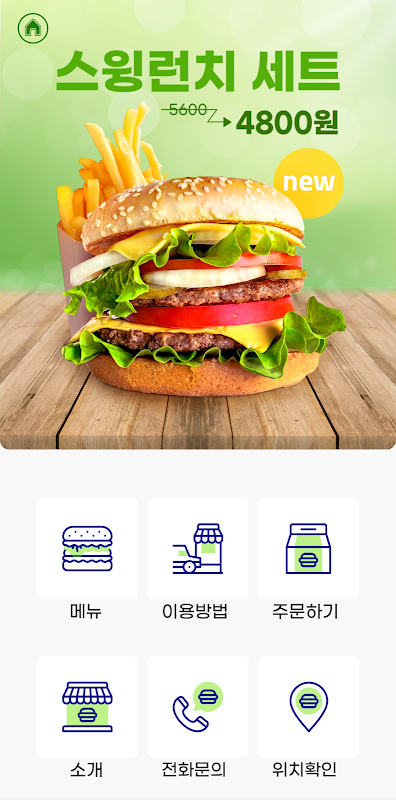 스윙투앱으로 제작된 레스토랑 업종 픽업 및 포장 전문 샘플앱입니다.