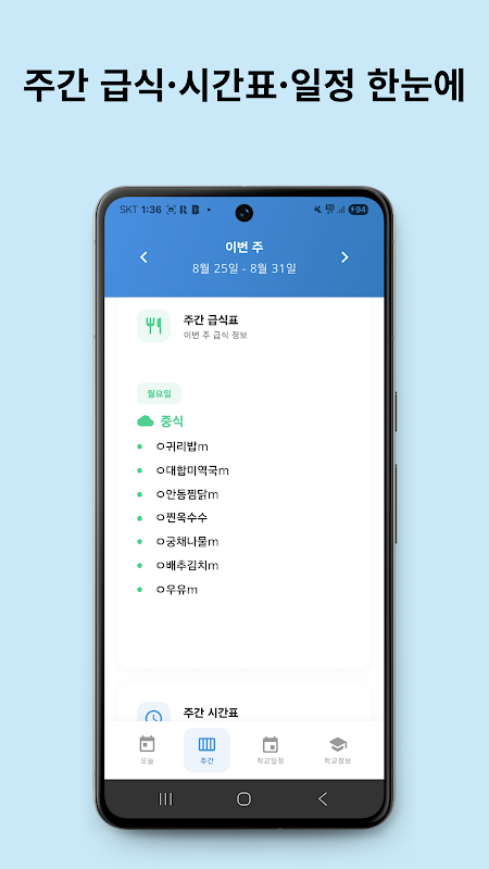 - 자녀별로 개별 시간표, 급식, 학사일정을 확인 가능