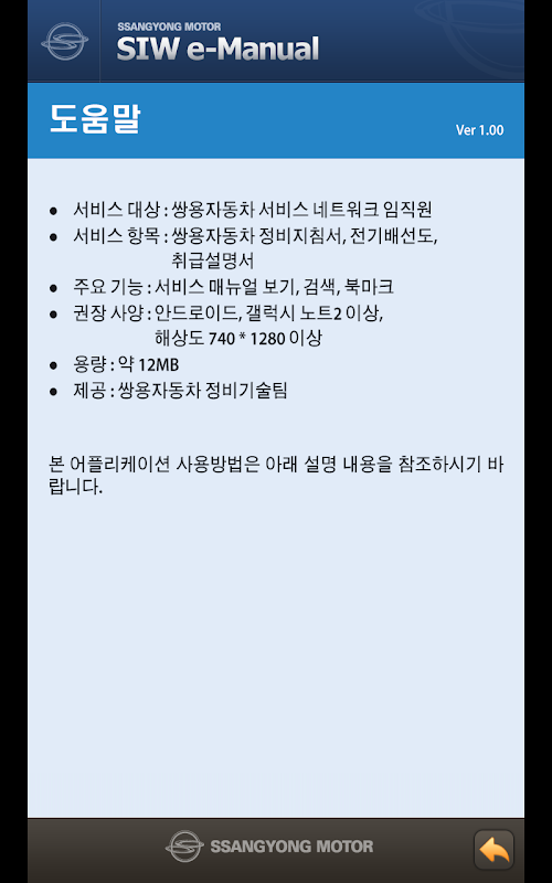 This application was developed for employees of the KG Mobility service network, and those who are interested in our service manual can read it after registering as a member at "http://siw.kg-mobility.com".