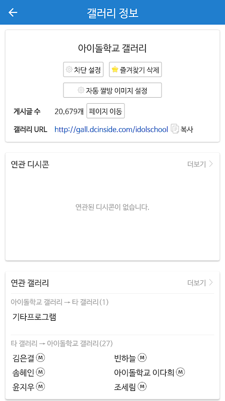 아이돌학교 갤러리 공식앱은 국내 최대 커뮤니티 디시인사이드(dcinside) 갤러리 중 아이돌학교 갤러리에 특화되어 있는 앱입니다. 갤러리 바로 접속, 커버 이미지, 추천 수 필터링 기능, 연관 디시콘 등 특별한 기능을 제공합니다.