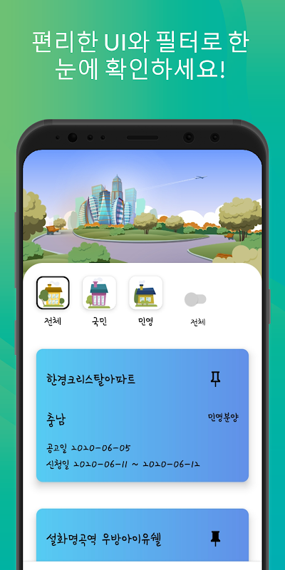 - 민간/국민 분양 공고 모두 한 눈에 보실 수 있습니다