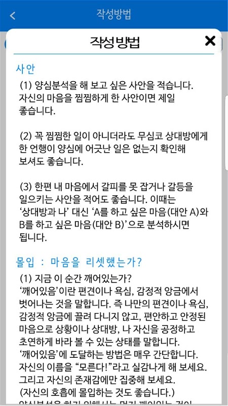 - 양심노트를 작성하고, 저장/관리하며, 텍스트로 카톡, 페이스북 등 다른 어플리케이션에 공유할 수 있습니다.