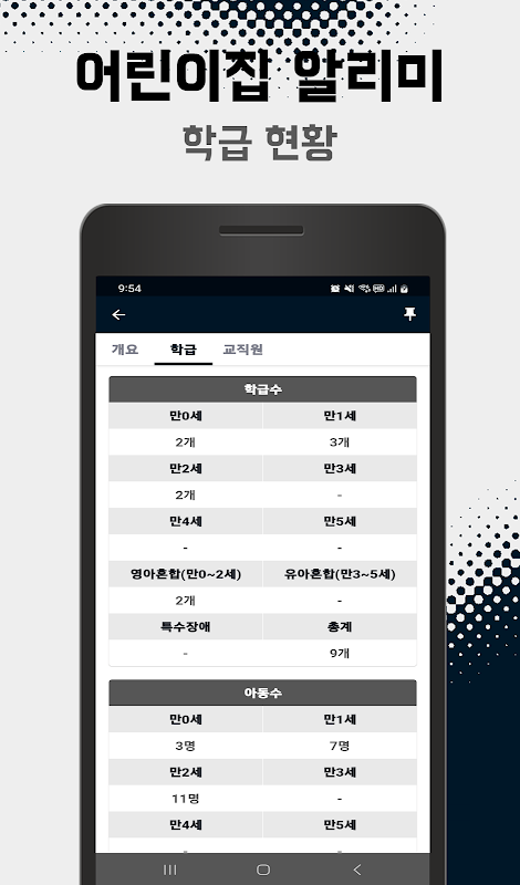 - Operation status: Provides detailed data on the overall operation of the daycare center, such as class composition, number of teachers, number of students, meal information, and availability of transportation to and from school.