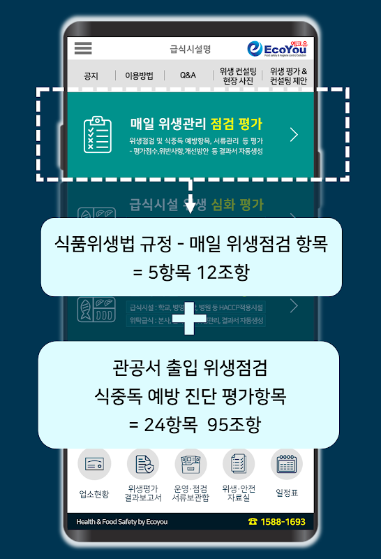 ③ Nutritionists who manage nationwide catering facilities can independently evaluate and write hygiene diagnosis and evaluation and operation/inspection documents of the catering facilities they manage on their own smartphone or PC, and save them as web or PDF files or print them for storage. ④ The Eco-U food service hygiene diagnosis program is free to use, except for some functions.