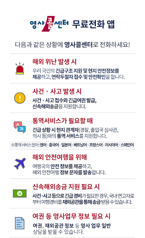 -It provides emergency rescue support and local safety information for the Korean people, and receives and confirms safety when lost in contact.
