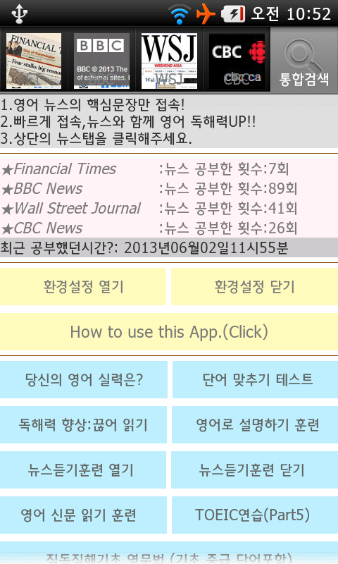 본 앱은 뉴스의 핵심 문장만을 추려내어 어휘력및 문장 해독 능력을 향상시킬 수 있고 무엇보다 지루하지 않게 하루에 틈나는 데로 틈틈이 볼수 있도록 하였습니다.또한 세계 뉴스를 영어로 파악할 수 있어 어휘력을 늘릴려는 분에게 도움을 드리고자 합니다.많은 이용 바랍니다.