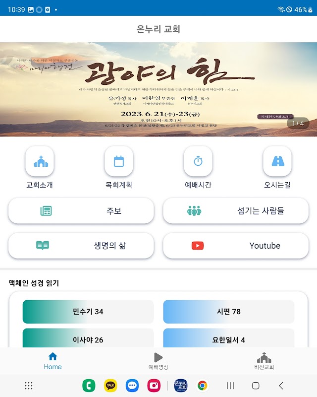 The Onnuri Church app has been configured so that members can easily access and use the Onnuri Church homepage. You can check and watch the video contents and worship videos of Onnuri Church Youtube in real time.