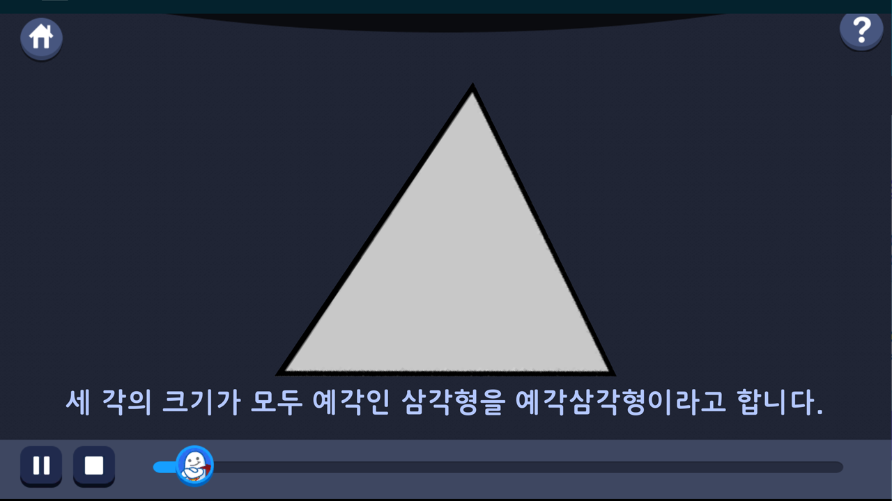 애플리케이션을 열면 4학년 1학기 3단원 각도와 삼각형에 대한 3D 도형 영상학습을 제공하고 있습니다.
