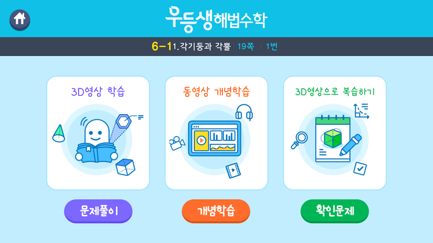 도형 영상학습은 3D 도형 문제풀이, 개념학습, 확인문제로 구성되어 있습니다.