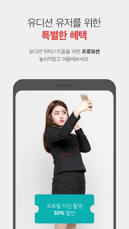 • 오디션을 볼 때 가장 중요한 프로필 사진! 유디션 아티스트들이라면 프로필 사진 할인 혜택을 받을 수 있습니다. 멋진 프로필 사진으로 오디션에 지원하세요.