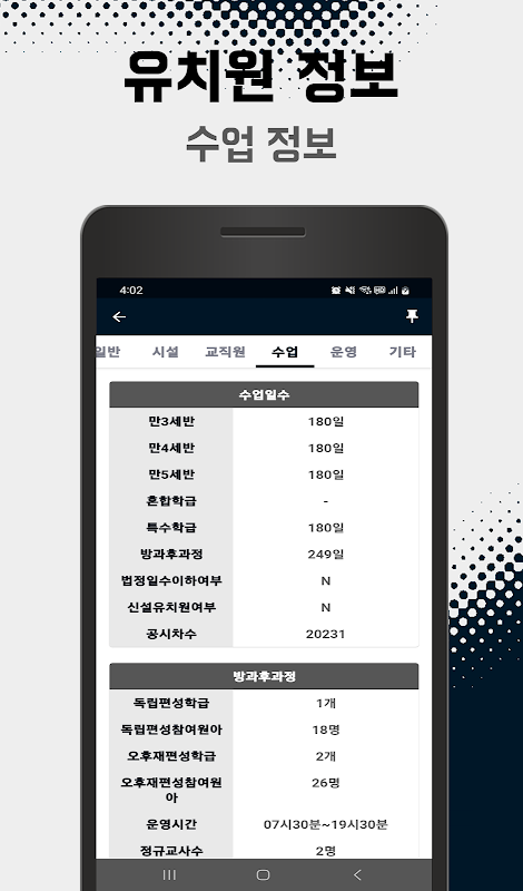 - Operation status: Provides detailed data on overall kindergarten operation, such as class composition, number of teachers, number of students, meal information, and availability of school buses.