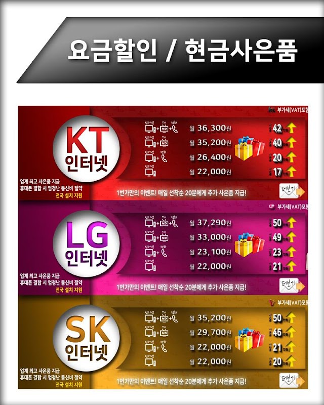 Statistically, the number of Internet subscribers is reaching its maximum. As a result, three major Korean telecom companies (LG SK KT) offer many discount and consolidation events in order to secure the consumers who receive the installation. .