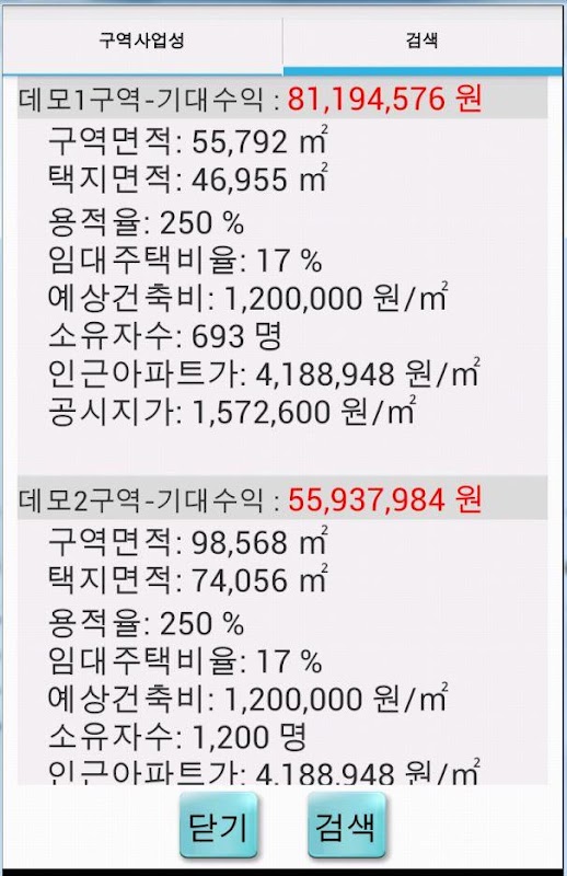 재개발의 경우 일반분양가, 용적률, 토지등소유자수, 건축비용 등 여러 변수에 의해 사업성이 좌우됩니다. 부동산 재개발 계산기는 이러한 여러가지 변수들을 표준화된 계산방식으로 수익금액을 제공하여, 구역을 합리적으로 선택할 수 있게 도와드립니다. 또한 대상 물건의 권리가액을 추정할 수 있어, 매수 금액을 산출하는데 도움이 됩니다.