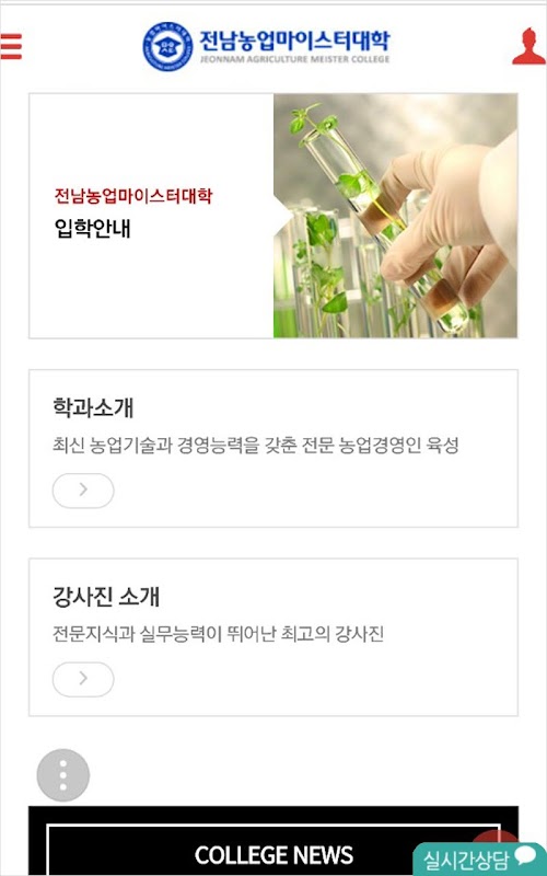 저희 전남농업마이스터대학은 지역의 핵심품목과 전략품목을 중심으로, 이론에 기초를 둔 실습중심형, 실용가능한 현장밀착형, 합리적인 사고에 기반을 둔 과학농업형, 신소득창출이 가능한 아이디어개발형, 지역농업발전의 기수가 될 수 있는 선도농가형, 고부가가치 창출이 가능한 최고기술형 교육을 실현하고자 최선을 다하고 있습니다.