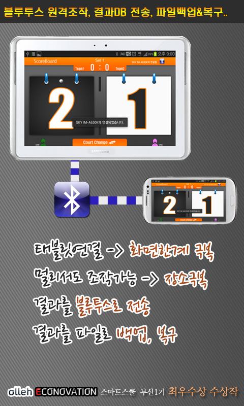 화면이 작은 스마트폰의 한계를 뛰어넘게 하기 위해서 블루투스로 연결하여 원격으로 조정할 수 있습니다. 태블릿에 연결한다면 큰 화면으로 보여줄 수 있습니다. 그리고 점수판으로 사용하는 기기는 경기장 옆에 두고, 카운트 하는 사람은 멀리 앉아서 카운팅 할 수도 있습니다. 가장 간단한 조작으로 연결되며 사용가능 합니다.