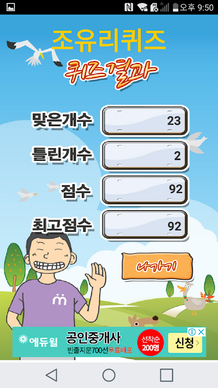 첫 화면에서 시작하기를 터치하시고 다음 화면에 나타난 "Go"를 터치하면 퀴즈 풀기가 시작됩니다. 정답과 오답이 될때마다 "O"와 "X"가 나오는데 이를 터치해야 다음 문제로 넘어갑니다.