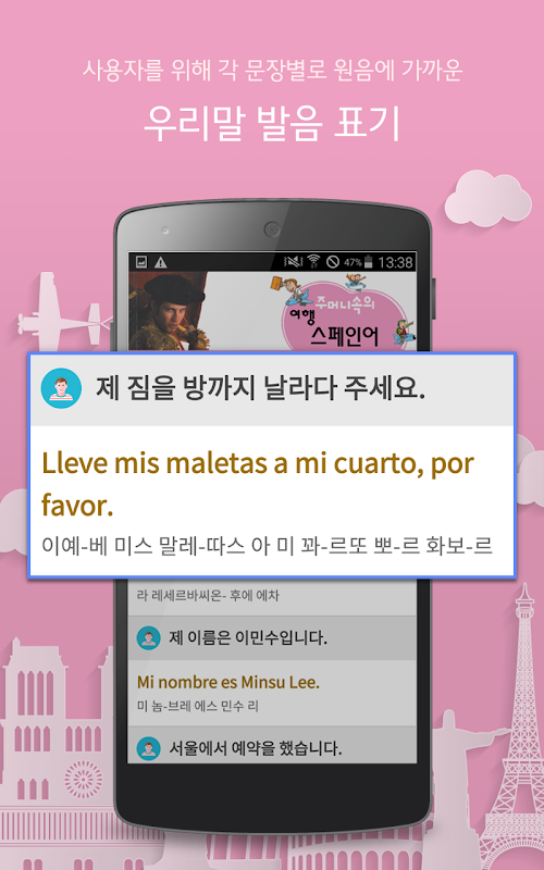- 각 문장별로 원음에 가까운 우리말 발음을 표기하여 외국어를 모르는 분들에게도 많은 도움이 될 것입니다.