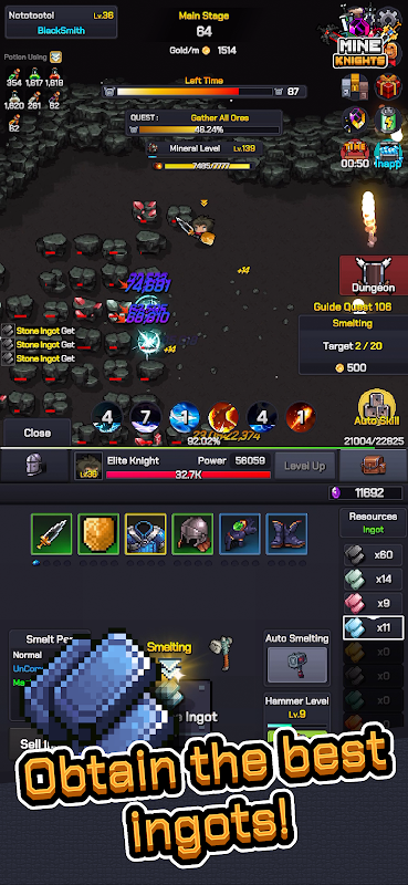 Destroying ore in the mines will give you minerals. The deeper you go into the mines, the better minerals you can acquire! Use these minerals to obtain the most powerful equipment. Give it a try now!
