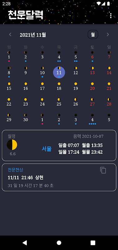 This app is an application that provides information to users who are interested in astronomical phenomena by using the astronomical phenomenon and lunar age information of the Korea Astronomy Research Institute of the public data portal.