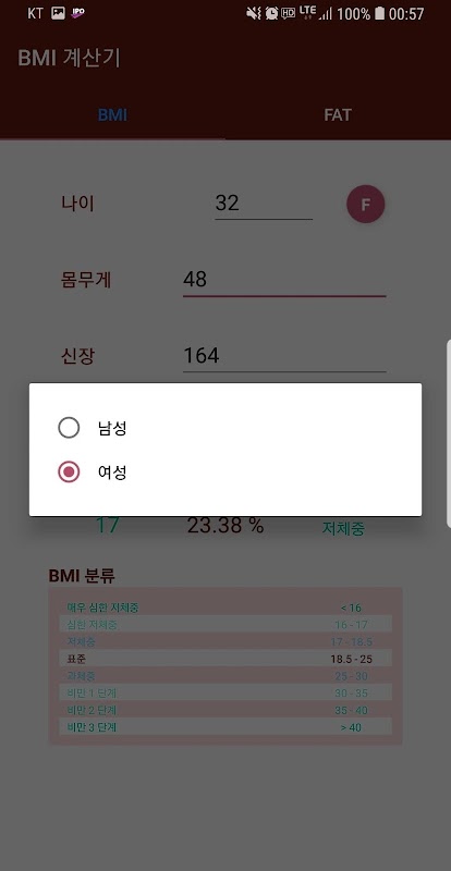 I can calculate my body mass (BMI) level and FAT level, and check my current position through the obesity classification table.