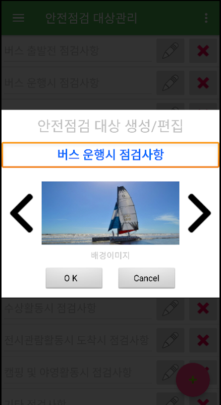 설치후 앱을 실행해 보시면 체험학습 운영시 필요한 안전점검 항목과 대상이 미리 작성되어 있습니다. 필요한 항목을 추가/편집하여 사용하시면 됩니다.