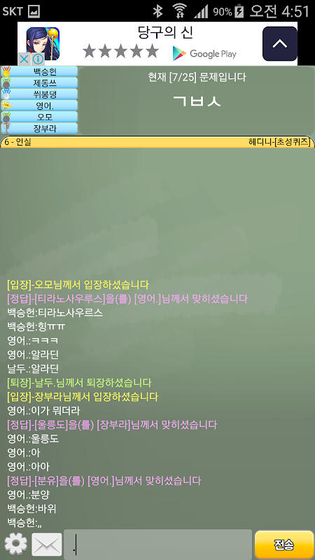 나타나는 초성과 힌트를 보고 정답을 채팅창에 적어서 맞히는 게임!!