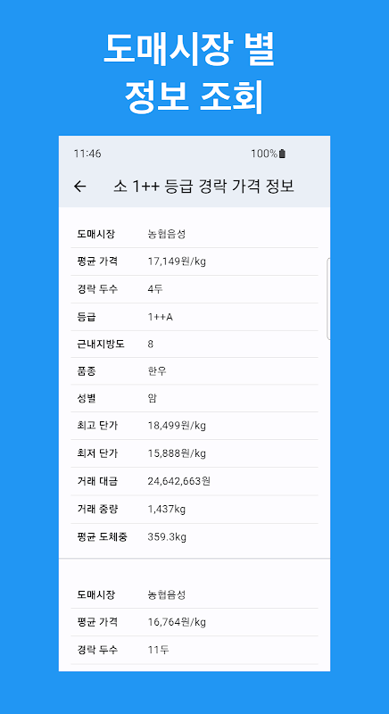 The ‘Livestock Product Information’ app, developed using the public API of the Livestock Product Quality Evaluation Institute, provides auction price information for each livestock wholesale market across the country. You can check the price of livestock products using several options. In the cattle 1++ grade search menu, you can search for the highest/lowest unit price, transaction amount, etc. by selecting the date, wholesale market, breed, gender, etc. This app allows you to understand market trends needed for livestock farming.