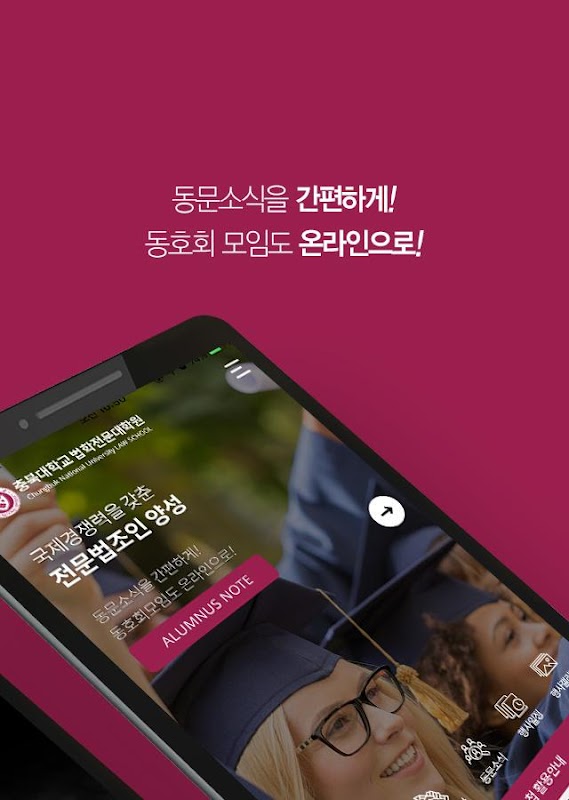충북대학교 법학전문대학원 소식과 동문 정보를 열람할 수 있는 모바일 수첩 어플리케이션입니다.